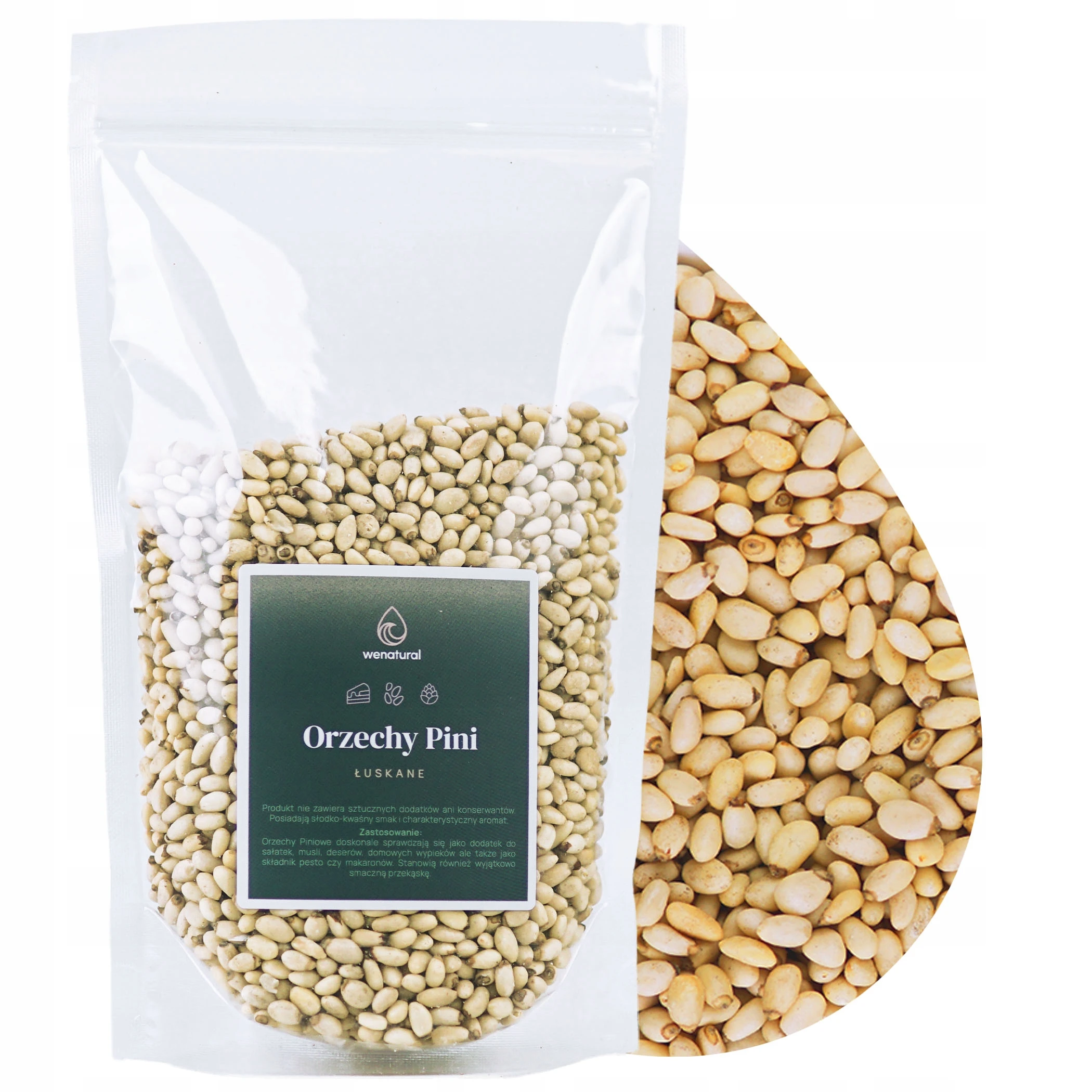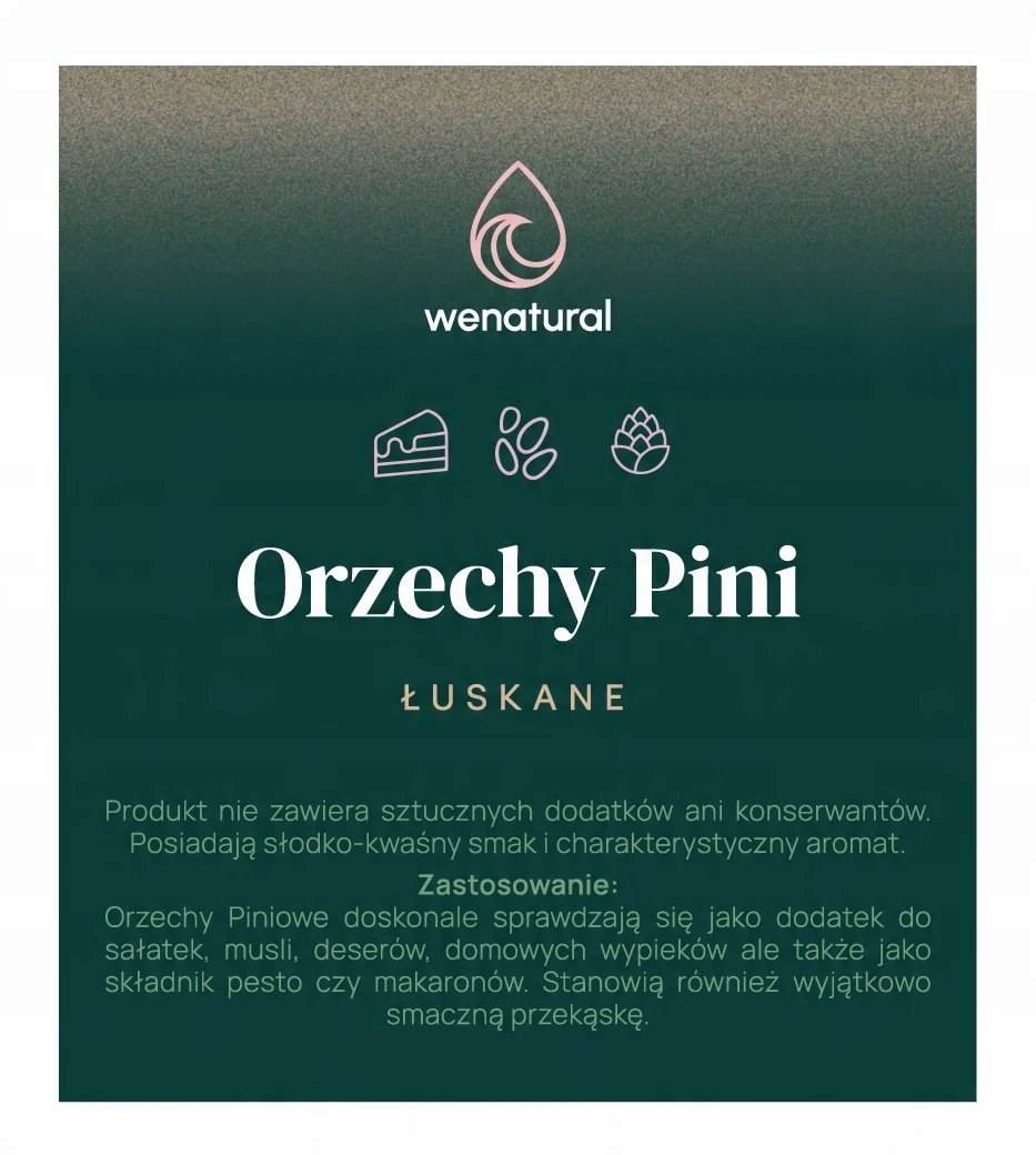 Orzechy Pini WenaturalOrzechy Pini - Naturalny skarb smaku i zdroowia Można je spożywać na surowo lub po krótkim blanszowaniu – doskonale wzbogacają smak sałatek, makaronów oraz domowego pesto. Świetnie komponują się z daniami kuchni śródziemnomorskiej! Świetnie nadają się także jako źródło wartości odżywczych. | |